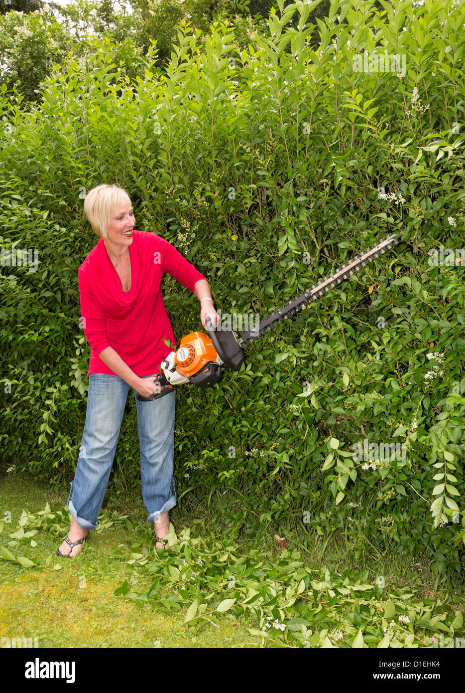 Woman with a power hedge trimmer Stock