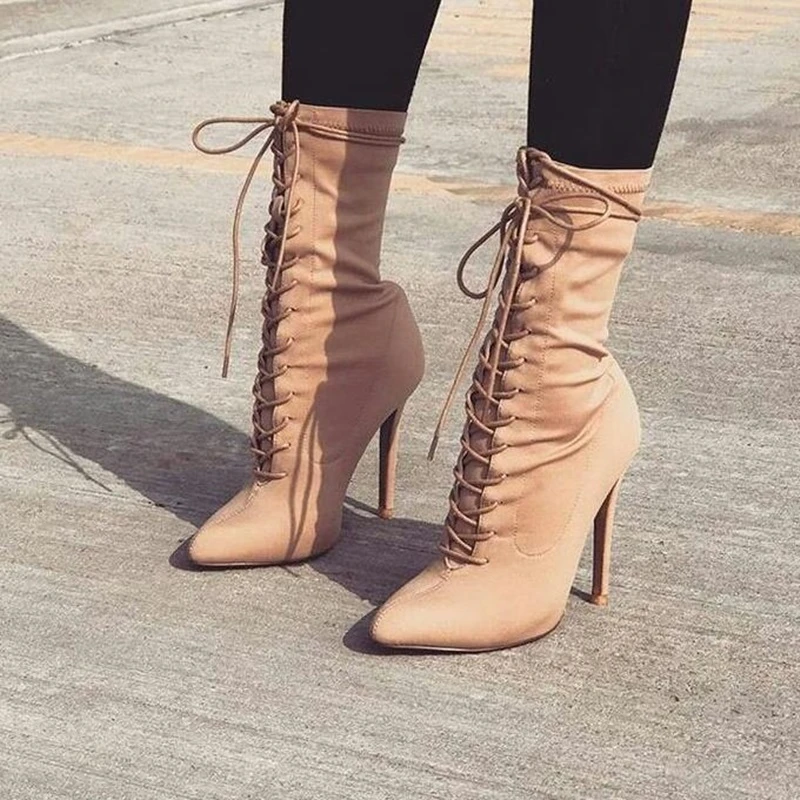 Sexy Beige Stretch High Heel Boot tan lace up heel boots